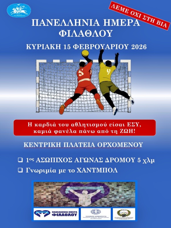Με κεντρικό σύνθημα «ΛΕΜΕ ΟΧΙ ΣΤΗ ΒΙΑ» και μήνυμα «Η καρδιά του αθλητισμού είσαι ΕΣΥ, καμιά φανέλα πάνω από τη ΖΩΗ!», ο Ορχομενός τιμά την Πανελλήνια Ημέρα Φιλάθλου την Κυριακή 15 Φεβρουαρίου 2026, στέλνοντας ένα ηχηρό μήνυμα υπέρ του σεβασμού, της ευγενούς άμιλλας και της ανθρώπινης ζωής.